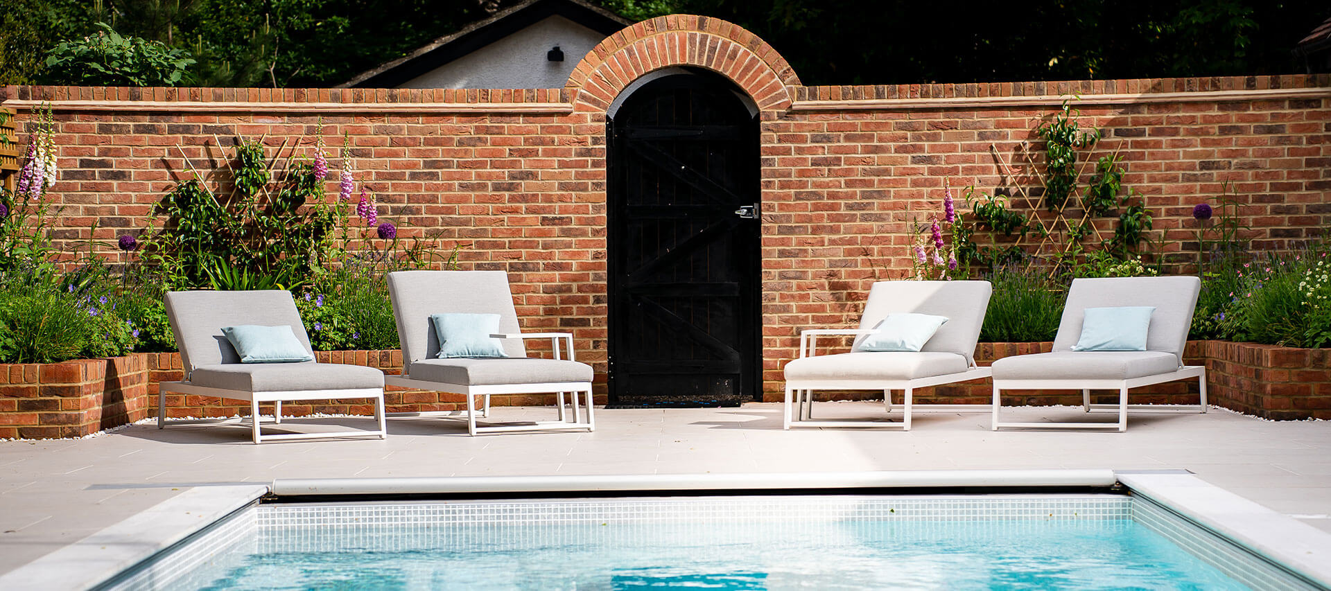 With our client’s requirements firmly in mind, our design team created a garden with high spec porcelain pool surround, complete with a new tall brick wall entrance with brick arch and bespoke gate. The Design included a new covered lounge and cooking area for increased usability. The Lower garden was to have a formal lawn edged with brick pathways to compliment the coach house exterior.