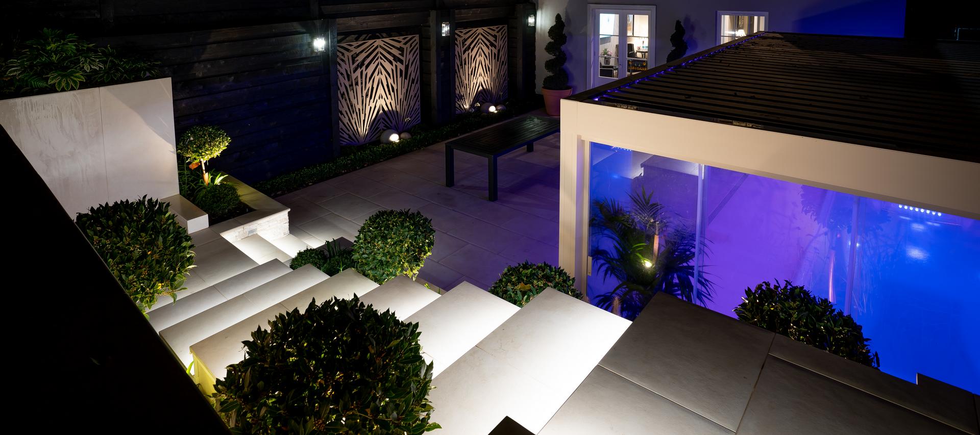 Our design was to include an indoor Swim spa set within an aluminum louvred Pergola with glass surround, guaranteeing full use all year round. New Landscaping to carry the feel of a Mayfair townhouse garden with staircase to upper garden which would feel light in appearance in it’s North facing aspect, materials of highest specification to be used offering the lowest possible maintenance but a high impact finish.